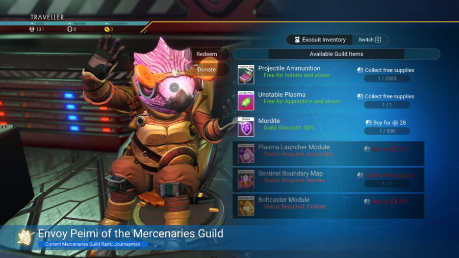 Swiftly advance in standing with the Merchants, Explorers and Mercenaries Guilds by donating surplus materials to Guild treasuries. Approach space station envoys to browse a list of their currently desired items.