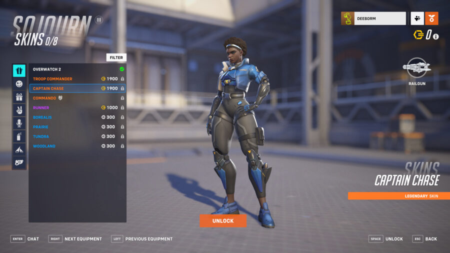 Sojourn (Captain Chase): As a new character, Sojourn doesn’t have as many skins as the others. The best look for her at the moment is Captain Chase in a cool blue. It’s not especially Legendary, though. Better to wait for Blizzard to give her better skins before buying this one.