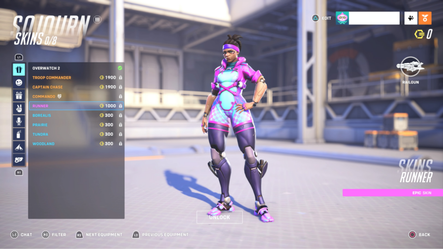 Sojourn has eight skins in Overwatch 2 at launch. You can see their names, rarity, and cost or unlock conditions below.