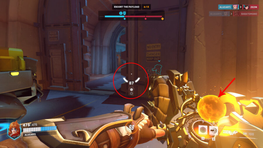 To check how high your energy level is, there are two indicators on the screen. The first is a half-circle with a number in the middle. The second one is the sphere of energy on Zarya’s Particle Cannon that gets bigger depending on the Energy level. Your energy level will begin to decrease after some time without taking damage with a shield up.