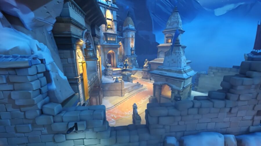 The Push track ends at the entrance of Shambali Monastery’s temple, denoted by a golden circle on the ground and four statues overlooking it. This area can get crowded quickly and heroes will often get melted by enemies in the elevated area surrounding it, so players will find more success fighting off to the side. There are staircases to the left and right of the final point, leading to a slightly elevated area that can be used to defend against the attackers. Again, setting up a Torbjorn turret here can be super effective if placed correctly. Attackers, on the other hand, will want to take control of these areas to prevent that. Unlike the town section at the start of the track with multiple balconies for both teams, there is only one elevated section in this area, so both sides will want to fight for control of the high ground.