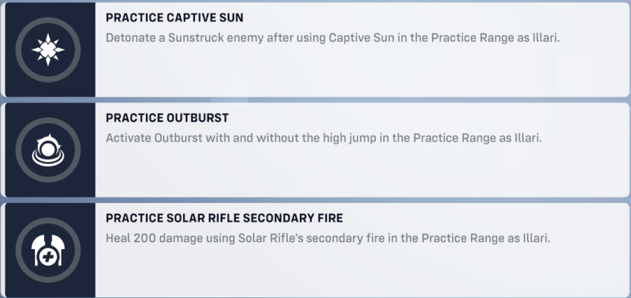 - Practice Solar Rifle Secondary Fire: Heal 200 damage using Solar Rifle’s secondary fire in the Practice Range as Illari.