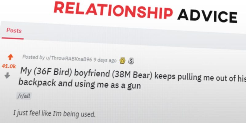 “I just feel like I’m being used,” begins the now-deleted Reddit post entitled My (36F Bird) boyfriend (38M Bear) keeps pulling me out of his backpack and using me as a gun. “I have no agency in this relationship. For the most part, I don’t get to decide where we go — I rarely get to be the one walking. I get shit talked constantly by strangers, and my boyfriend never defends me. He uses me as a tool, he smacks me against other people. He ground pounds me. But I just don’t know what to do, he’s the only person I really know and I still love him.”