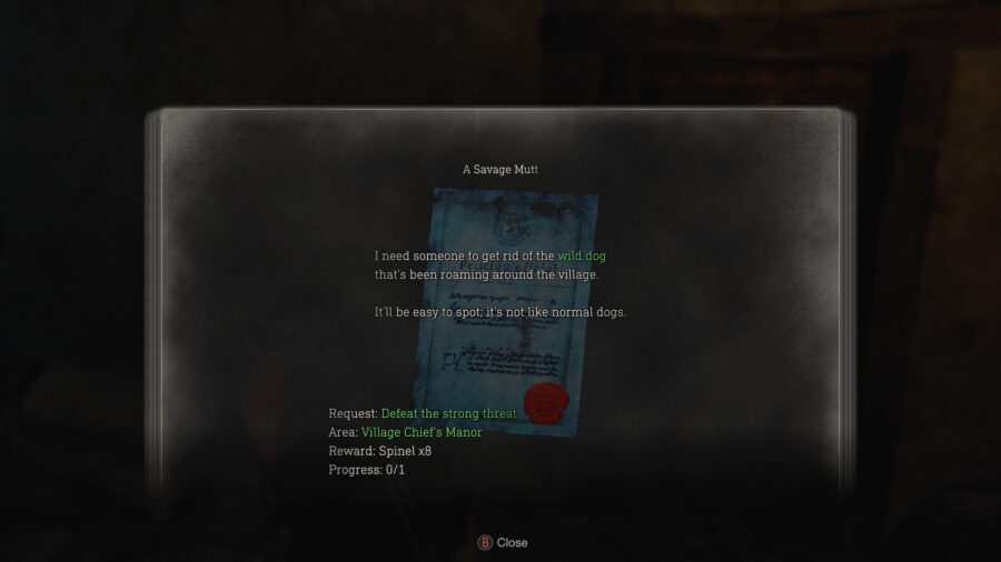 The task for this request is to kill a distinct Colmillo (Las Plagas-infected wolf) that’s been deemed a “strong threat”. Its location is marked as being around the Village Chief’s Manor. It’s a little out of the way from the main objective of the chapter, but it’s only a quick detour from the village area.