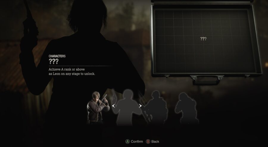 The three locked characters are represented with silhouettes and if you’ve played the story you’ll recognize Luis as the first one. Hovering over his silhouette will give you the straightforward unlock condition to “achieve A rank or above as Leon on any stage.”