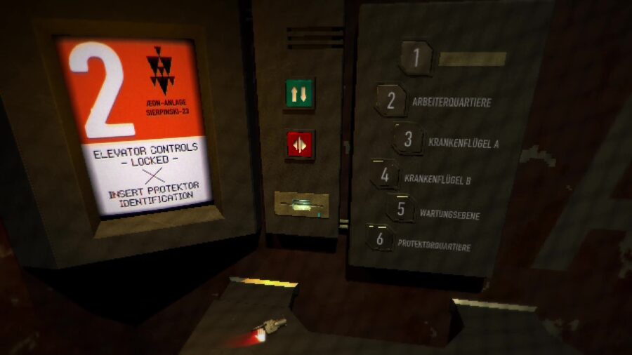 One of those elevators is visibly out of service, but the other just requires a keycard. If you look on the shelf built into the elevator’s control panel, however, you can find and take the Service Hatch Key.