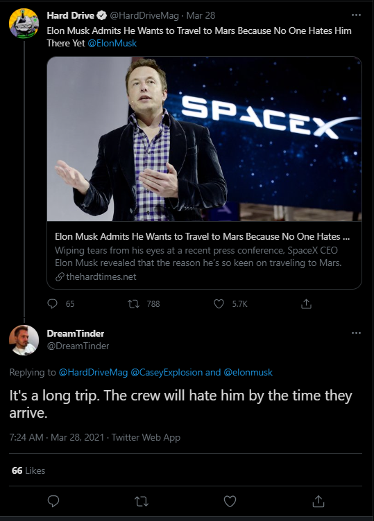 Finally, Elon Musk will have created something all by himself: the circumstances of the inevitable space mutiny that will reassign him to a short term position in the ship’s airlock. Redditors everywhere will feel a chill down their spine, instinctively knowing they want to protect Elon without knowing how.