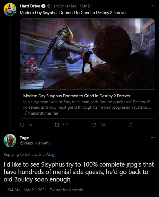 Something similar happened with Prometheus, where they offered to let him do 101% speedruns of Donkey Kong 64 for eternity, but he was reportedly worried about who would take care of the eagle that had been eating his liver for thousands of years.