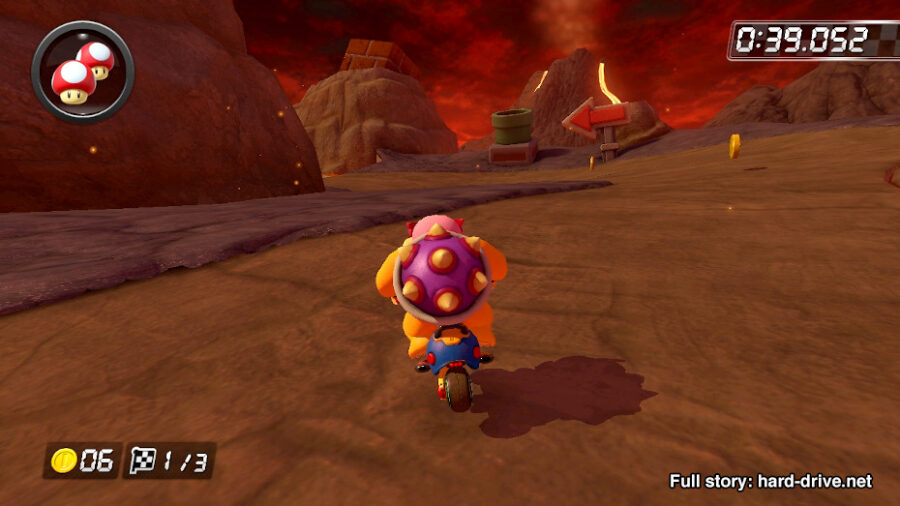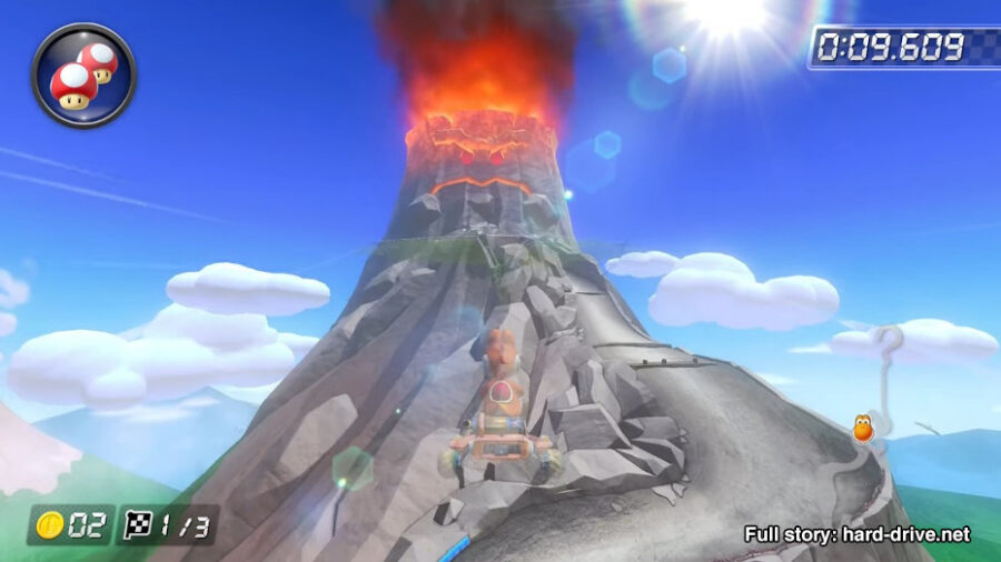 Grumble Volcano doesn’t want you here. Fuck around and you will find out. Balls of fire are raining down. The track literally crumbles around you. By lap three, things have fallen apart more than my last relationship.