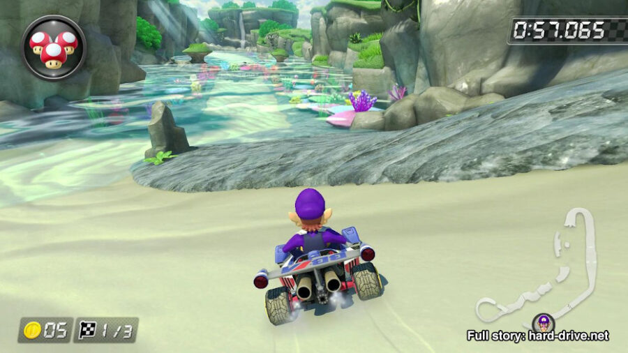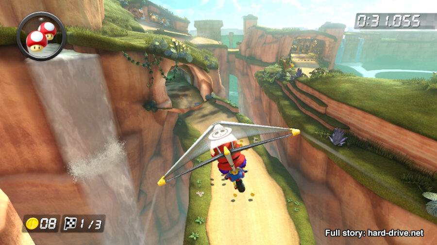 A perfect proof of concept for Mario Kart 8’s anti-gravity feature. Leave behind your Mario Circuits, your Toad Harbors, your Wario Stadiums. Let’s make like salmon and drive up a goddamn waterfall.