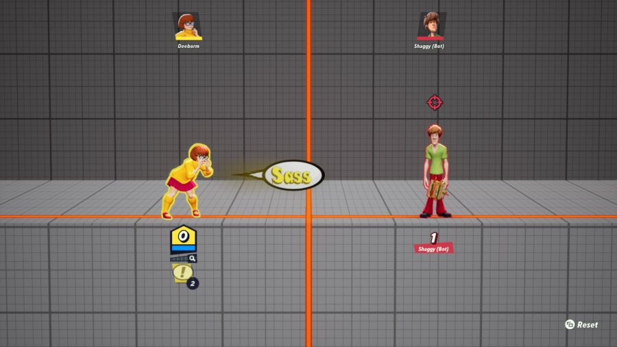 - Neutral Ground Attack: Most characters have a heavy, charged melee attack for their neutral. Not so for Velma. Instead, she shouts a fast-moving projectile that tracks her ally. If it connects, and it usually does, the ally becomes marked. If someone’s marked, this attack changes. Pressing the button again will send out a speedy word bubble projectile that follows the marked target. If this hits your ally, it rebounds forward. It’s like making your ally throw a free projectile, which also applies a weakness debuff. There’s a lot going on with this attack. It has a low ammo count, so Velma has to wait a while in between sets of shots. The initial tracking shot can hit an enemy if they’re in between you and your ally, which lets you follow up with homing projectiles, but it can also get caught on the floor. Generally, though, it’s fine to use it as often as possible. Thanks to its tracking, it’ll almost always have some effect.