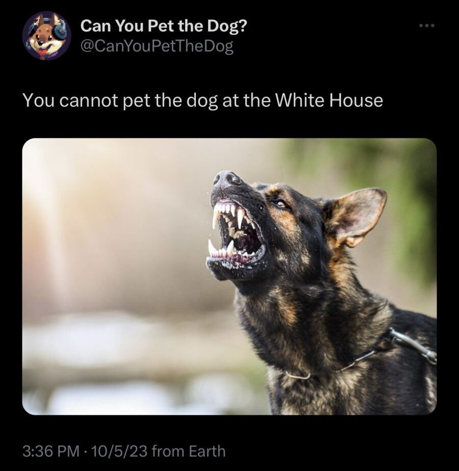 WASHINGTON — President Joe Biden and first lady Dr. Jill Biden’s two-year-old German shepherd, Commander, does not support petting as players have come to expect. This was confirmed earlier today via a series of tweets by popular Twitter/X account, @CanYouPetTheDog.