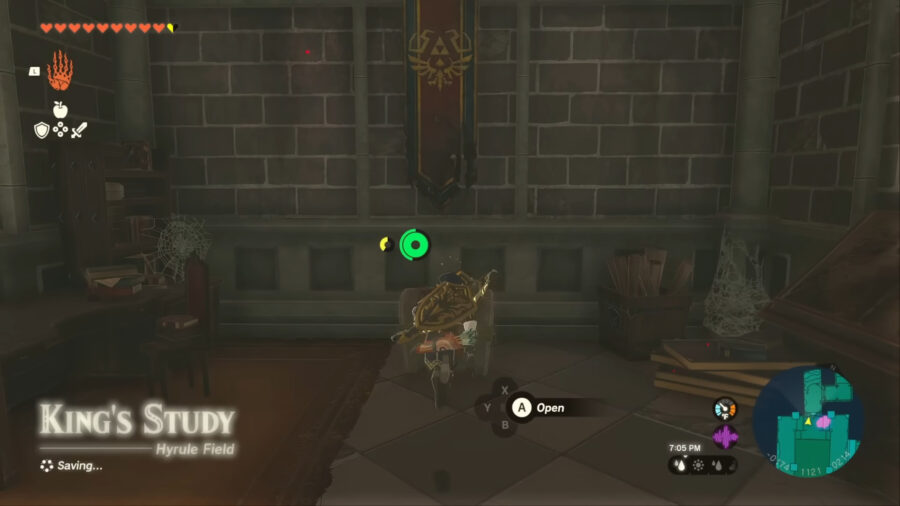 Fast travel to Serutobomac Shrine and enter the doorway set in the hill beneath it at -0206, 1169, 0261, to reach Hyrule Castle B3. At the other end of the passageway head left into the Library. Jump over the bannister with the debris pile, to the bottom level of the Library. Directly behind you is a bookcase you can use Ultrahand on. This is the King’s Study and the chest within holds the Royal Guard Boots.