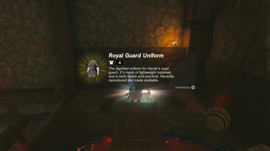 Yet again, launch yourself out of Lookout Landing Skyview Tower to glide to the south-west of Hyrule Castle, and the gateway set into the rock at -0321, 0774, 0074. Use Ultrahand to get past two successive gates and go left up the stairs. At the top, follow the hallway to the left, and enter the first doorway on the left. At the bottom of these stairs is the Guards’ Chamber. Navigate to -0392, 0867, 0060 and use Ascend to phase through the ceiling. Up here and across the gap is a chest containing the Royal Guard Uniform.