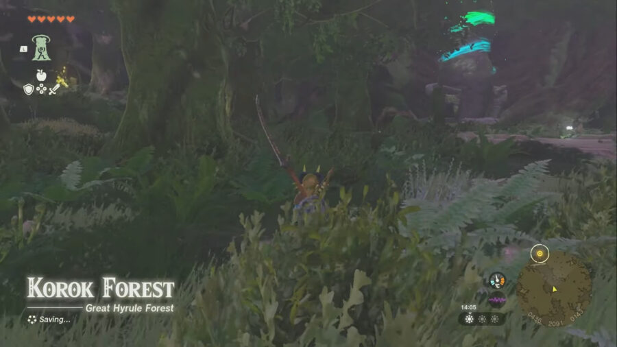Navigate to 0421, 2150, 0150 in Korok Forest, and look up to the left of the tunnelway, for the Forest Dweller’s Shield just sort of stuck high up there. You will need to use Ultrahand to get it down and claim it as your own.