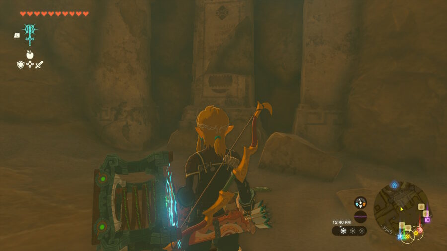After you get this snapshot (or if you’re killing time while waiting for hours to pass), continue down the path and go left at the fork in the road. Keep looking to your left, and you’ll see a busted stela with a large sand pile in front of it. Use some sort of wind (Korok Frond Guster, Fan) to blow the sand away.